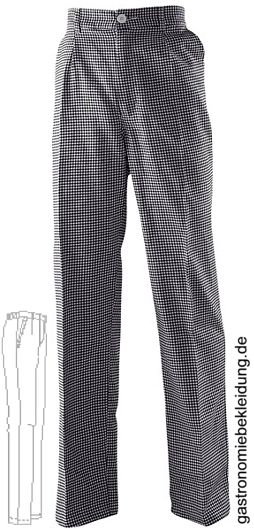 Ca. 230 g/m², 60° waschbar, Industriewäsche geeignet, Kochhose Herren schwarz/weiß Pepita, 1 Bundfalte, Sattelnaht, Schlitz mit Metallreißverschluss, 2 Seitentaschen, 2 Gesäßtasche, Bund mit Dehnzone, Schrittlänge bei Gr. 50 ca. 83 cm, Gürtelschlaufen, Lieferung erfolgt ohne Gürtel, Gr. 38-74, 90-110, 21-30
