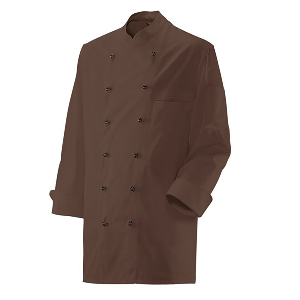 Ca. 220 g/m², 75° waschbar, Kochjacke dunkelbraun toffee 2-reihig, 6 Knopflochreihe, Trapezform, Wienernähte, Stehkragen, Ärmel mit doppelten Umschlag, innenliegende Brustleistentasche, Ärmeltasche Breite x Höhe ca. 9x12 cm, Knöpfe bitte extra bestellen, Gr. S-5XL