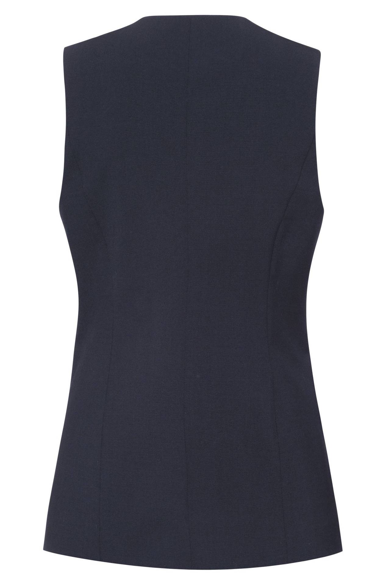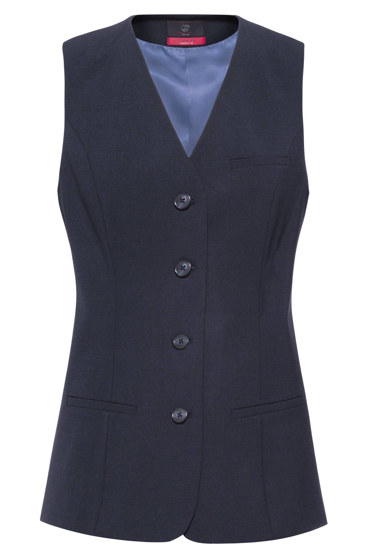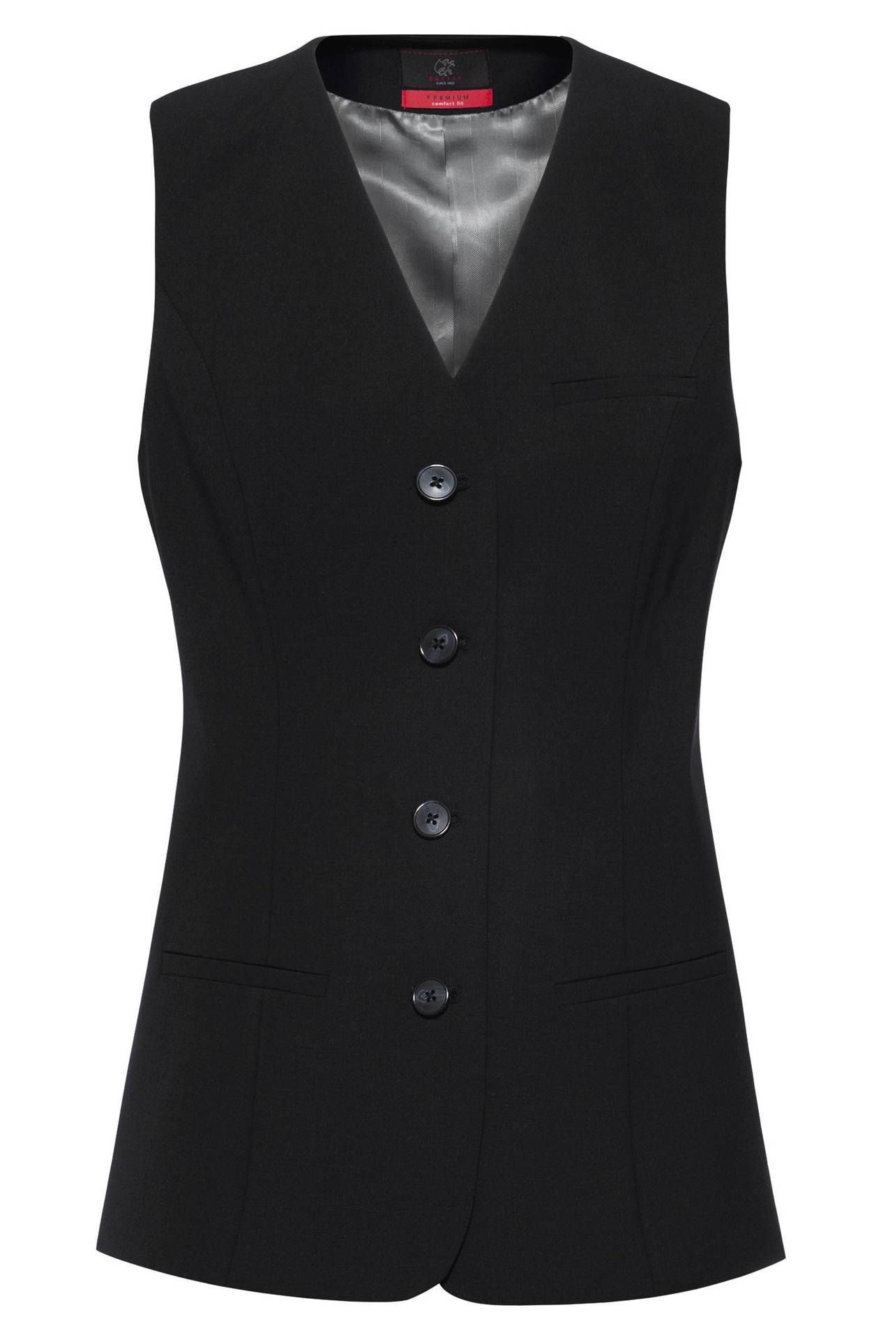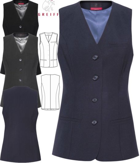 Ca. 200 g/m², 30° waschbar, Bi-Stretch, Wasser- und Schmutzabweisend, knitterarm, Comfort Fit, Greiff Weste Damen in schwarz, anthrazit und marineblau wählbar, ohne Kragen, V-Ausschnitt, 1-reihig, leicht tailliert, Stoffrücken, 2 Leistentaschen, 1 Brustleistentasche, 1 Innentasche, Rückenlänge bei Gr. 38 ca. 66 cm, BITTE WÄHLEN SIE DIE FARBE AUS, Gr. 32-60