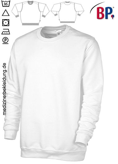 Ca. 400 g/m², einlauf- und formstabil durch Vorwäsche, farbecht, chlorecht und kochfest durch hochwertige Färbeverfahren, Schulterverstärkung für mehr Formstabilität, 1/1-Arm, BP Sweatshirt mit Rundhals, Ärmel- und Saumbündchen, Gr. XS-4XL