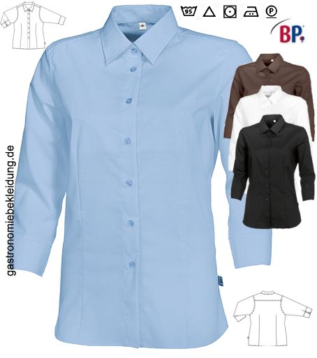 Ca. 125 g/m², 60° waschbar, ÖkoTex, pflegeleicht, elastische Faser, Stretch, 20% Dehnfähigkeit, erstklassiger Tragekomfort, BP Berufsbekleidung Bluse in weiß und schwarz erhältlich (hellblau und chocolate leider nicht mehr lieferbar), Hemdblusenkragen, Abnäher im Vorder- und Rückenteil, Teilungsnähte, 6-Knopf-Verschluss, Ärmel mit umschlagbaren Manschetten, Rückenlänge ca. 65 cm, BodyStyle = körpernahe Schnittführung, bitte wählen Sie die Farbe aus, Gr. 32-54