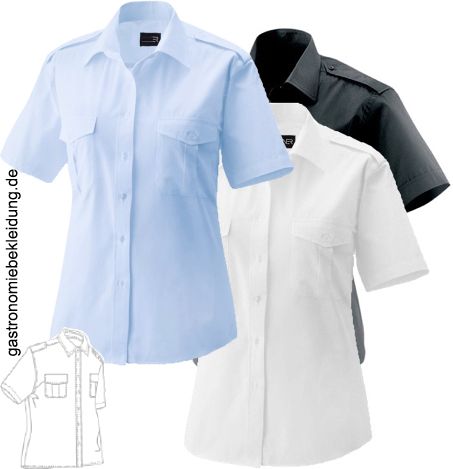 Ca. 120 g/m², 75° waschbar, weiß besteht aus Bio-Baumwolle und recyceltem Polyester, Pilotbluse knitterarm und pflegeleicht, Kentkragen, halbarm, Schulterklappen, 2 aufgesetzte Brusttaschen, gerade geschnitten, in weiß, schwarz und light blue erhältlich, bitte wählen Sie die Farbe aus, Gr. 32-52