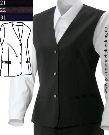 Ca. 270 g/m², 40° waschbar, Damen Weste schwarz, Rückenlänge bei Gr. 38 ca. 58 cm, 1-reihig, 3-Knopf, leicht tailliert, 2 Paspelseitentaschen, 1 Innentasche, Stoffrücken verstellbar, knitterarm, Gr. 32-52