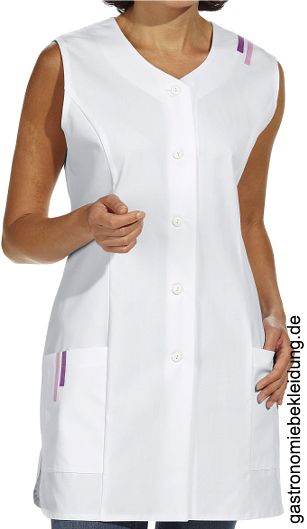 Ca. 190 g/m², 60° waschbar, Leiber Kittel ohne Arm weiß mit 2 Seitentaschen, Teilungsnähte, farbiger Besatz an Schulter und Tasche, Rundsaum, Rückenlänge bei Gr. 38 ca. 83 cm, Gr. 36-54