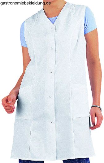 Ca. 215 g/m², 95° waschbar, Industriewäsche geeignet, Leiber Kittel weiß mit Druckknöpfen, Rückenspange, Biesenstepperei an Taschen und Schulter, 2 aufgesetzte Taschen, V-Ausschnitt, Rückenlänge bei Gr. 38 = ca. 88 cm, Gr. 36-60