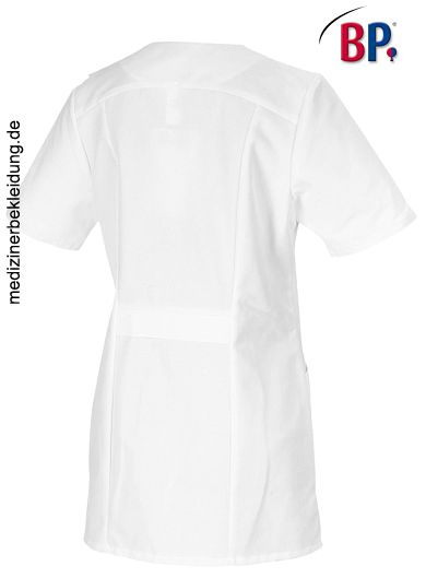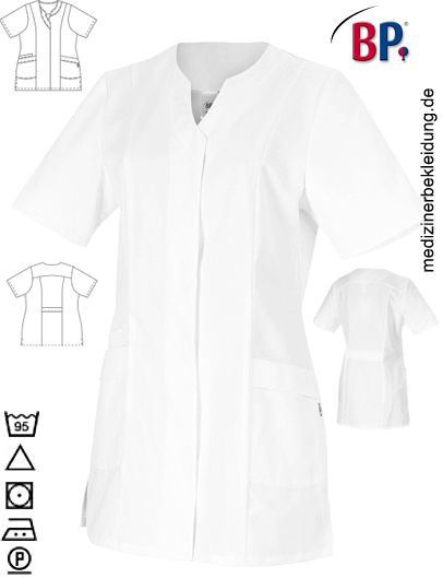 Ca. 215 g/m², pflegeleicht, kochfest, Industriewäsche-geeignet, BP Damen Kasack mit modisch gebogenen V-Ausschnitt, verdeckte Druckknopfleiste, 2 Seitentaschen mit Umschlag, 1 Piepertasche, Seitenschlitze und Rückengurt, Rückenlänge ca. 80 cm, figurbetont, Gr. 34n-52n