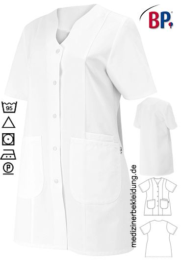 Ca. 215 g/m², pflegeleicht, kochfest, Industriewäsche geeignet, BP Kasack Damen weiß, 2 aufgesetzte Seitentaschen, 1 Seitentasche davon mit 1 Piepertasche , weiße Druckknopfleiste, Rückenlänge ca. 85 cm, Gr. 32n-58n