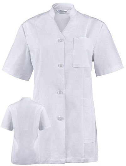 Ca. 200 g/m², Sanfor, 95° C waschbar, weiß, Gabardine, Chlorbleiche möglich, Hiza Kittel weiß mit modischer Kragenlösung mit Stehkragen und V-Ausschnitt, 1 Brusttasche, 2 Seitentaschen, Teilungsnähte an Vorderteil und Rückenteil, Seitenschlitze, Knopfverschluss, Rückenlänge ca. 74 cm, Gr. 52