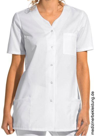 Ca. 190 g/m², 95° waschbar, Leiber Kasack weiß mit 2 Seitentaschen, 1 Brusttasche, Seitenschlitze, Brustabnäher, Taillenabnäher auf Rückenteil, Rückenlänge bei Gr. 38 ca. 76 cm, Gr. 34-52