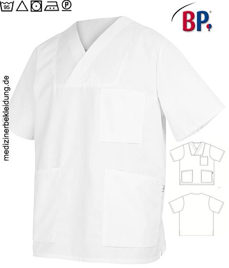 Ca. 205 g/m², pflegeleicht, kochfest, Industriewäsche geeignet, BP Schlupfkasack Herren & Damen weiß, 1/2 Arm, Kuvert-Ausschnitt mit Druckknopf, 1 aufgesetzte Brusttasche, 2 aufgesetzte Seitentaschen, Seitenschlitze, Rückenlänge ca. 78 cm, Gr. XSn-3XLn