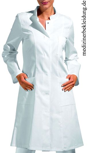 Ca. 200 g/m², 95° waschbar, Leiber Arztkittel Damen weiß mit Stehkragen, 2 Seitentaschen, 1 Brusttasche, verdeckte Druckknopfleiste, Gehschlitz, Rückenlänge bei Gr. S ca. 98 cm, Gr. XS-3XL