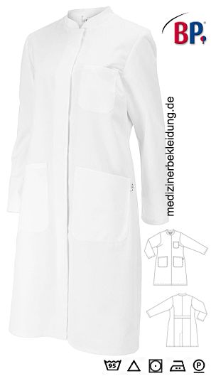 Ca. 220 g/m², kochfest und bügelfreundlich, Industriewäsche geeignet, pflegeleicht, BP Arztkittel Damen Arztmantel weiß, wie Art.-Nr. 111131521 aber mit verdeckte Druckknöpfe, 1 Brusttasche, 2 Seitentaschen, Stehkragen, Rückenschlitz, Rückengurt, Rückenlänge ca. 105 cm, figurbetont, Gr. 32n-56n