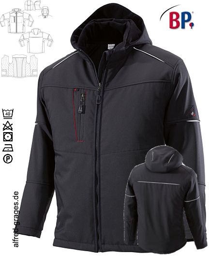 Ca. 300 g/m², komplett wattiert mit wärmendem Thermosteppfutter, BP Jacke mit Stehkragen, abzippbare und weitenregulierbare Kapuze, Frontreißverschluss mit Fleece-Kinnschutz, 1 Brusttasche und 2 Seitentaschen mit Reißverschluss, Reflexpaspel, ergonomisch geformter Ärmel, Windschutz am Ärmelabschluss, Armliftsystem für mehr Beweglichkeit, 2 Innentaschen, innenliegende Saumweitenverstellung, verlängerte Rückenpartie, Öko-Tex Standard 100, auf Basis von INTEX, Rückenlänge ca. 77 cm, Gr. XS-3XL