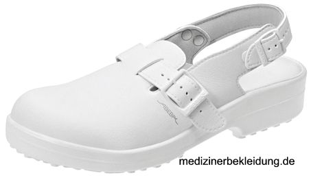 weiß, Damen- und Herrensicherheitsclog, EN ISO 20345:2012, antistatisch, Obermaterial Lorica, Microfaser, Stahlkappe (200 Joule), verstellbarer Rist- und Fersenriemen, feststehender Fersenriemen, Schnallenverschlulss, küchengeeignet, Energieaufnahme der Zehenkappe und im Fersenbereich, Beständigkeit der Schuhoberfläche gegen Wasserdurchtritt und Wasseraufnahme, 30°C waschbar, HACCP-CO²-Hygienisierung, SB, A, E, FO, WRU, SRC, Gr. 36-46