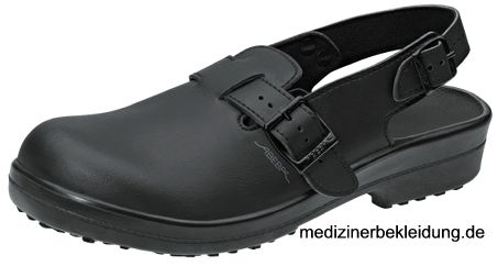 schwarz, Damen- und Herrensicherheitsclog, EN ISO 20345:2012, antistatisch, Obermaterial Lorica, Microfaser, Stahlkappe (200 Joule), verstellbarer Rist- und Fersenriemen, feststehender Fersenriemen, Schnallenverschluss, küchengeeignet, Energieaufnahme der Zehenkappe und im Fersenbereich, Beständigkeit der Schuhoberfläche gegen Wasserdurchtritt und Wasseraufnahme, 30°C waschbar, HACCP-CO²-Hygienisierung, SB, A, E, FO, WRU, SRC, Gr. 36-46