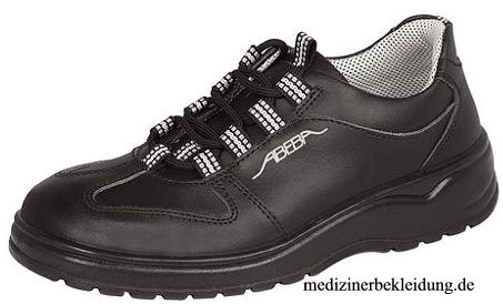 schwarz, sportlicher Sicherheitshalbschuh, EN ISO 20345:2012, antistatisch, Stahlkappe (200 Joule), Obermaterial Leder, Spezialinnenfutter mit Silver Point (schweiß- und feuchtigkeitsabsorbierend), auswechselbare acc-Wave Einlegesohle (Art. 3557), SRA-rutschhemmende PU-Sohle, küchengeeignet, S2, SRA, Orthostat möglich, Gr. 35-48