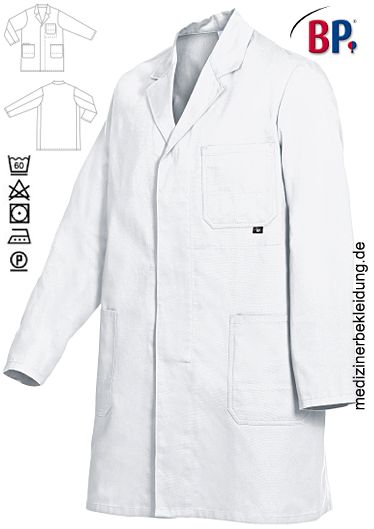 Ca. 200 g/m², 95° waschbar, weisser Arbeitskittel Herren BP in 3/4-Länge (Rückenlänge ca. 96 cm), langarm, verdeckte Knopfleiste, 1 Brusttasche, 2 Seitentaschen, davon 1 mit Universaltasche, 1 Innentasche, Gr. 44/46-64/66