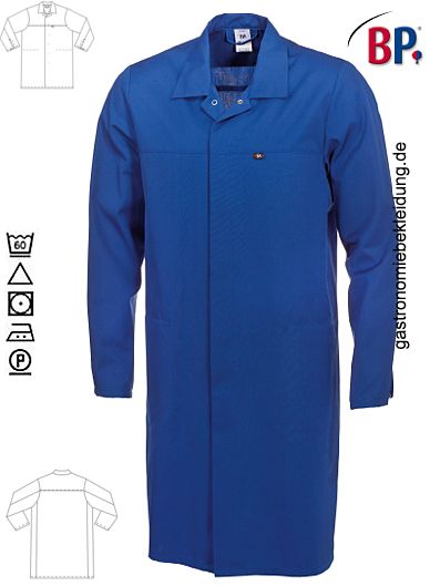 Ca. 215 g/m², 60°C waschbar (Abbildung in grau), 1/1 Arm mit verstellbarem Ärmelschlitz, Umlegekragen, verdeckte Druckknopfleiste, 1 innenliegende Brusttasche, 2 innenliegende Seitentaschen, Industriewäsche geeignet, Risikoklasse 1 nach DIN 10524:2004, Öko-Tex Standard 100, Nach HACCP entwickeltes Produkt, auf Basis von INTEX, Länge ca. S= 93cm N= 103cm L= 113cm, Gr. Ss-XLs, XSn-3XLn, Sl-2XLl