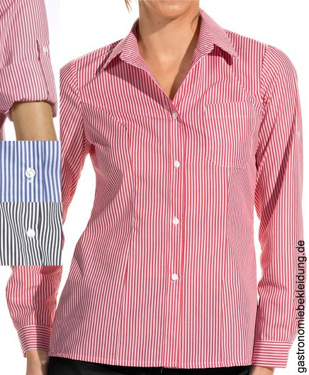 Ca. 125 g/m², 60° waschbar, Streifengewebe, Leiber Bluse gestreift in weiß/schwarz erhältlich (weiß/rot und weiß/blau nicht mehr lieferbar), Ärmel mit Krempelfunktion (Lasche und Knopf), Teilungsnähte, Brusttasche, Rückenlänge bei Gr. 38 ca. 67 cm, bitte wählen Sie die Farbe aus, Gr. 34-54