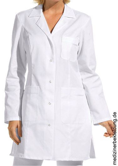 Ca. 190 g/m², 60° waschbar, Leiber Kasack Damen weiß mit 2 Seitentaschen, 1 Brusttasche, Druckknöpfe, Seitenschlitze, Satinbänder auf Taschen, Rückenlänge bei Gr. 38 ca. 85 cm, Gr. 36-52