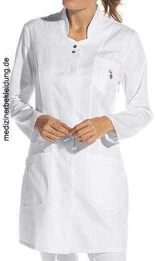 Ca. 180 g/m², 60° waschbar, Leiber Kasack lang weiß mit Druckknopfleiste, Herz-Accessoire auf Brusttasche, 2 Seitentaschen, Taillenregulierung durch Druckknopflaschen, Rückenschlitz, Rückenlänge bei Gr. 38 ca. 85 cm, Gr. 34-52