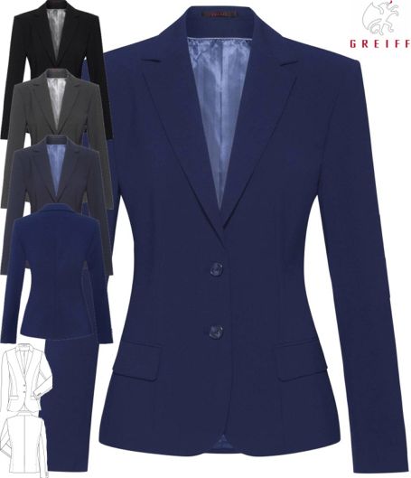 Ca. 200 g/m², 30° waschbar, Bi-Stretch, Slim Fit, wasser- und schmutzabweisend, 2 Pattentaschen, 1 Reißverschlussinnentasche, Seitenschlitze, Rückenlänge bei Gr. 38 ca. 58 cm, Greiff Blazer in schwarz, anthrazit und marine erhältlich, bitte wählen Sie die Farbe aus, Gr. 32-42