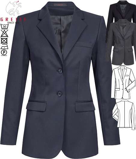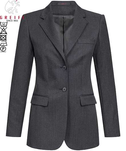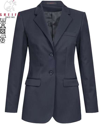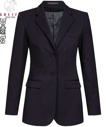 Ca. 235 g/m², 30° waschbar, Stretch, Regular Fit, wasser- und schmutzabweisend, 2 Pattentaschen, 1 Brustleistentasche, 1 Innentasche, Rückenlänge bei Gr. 38 ca. 68 cm, Greiff Damen Blazer in schwarz, anthrazit und marine erhältlich, bitte wählen Sie die Farbe aus, Gr. 32-54
