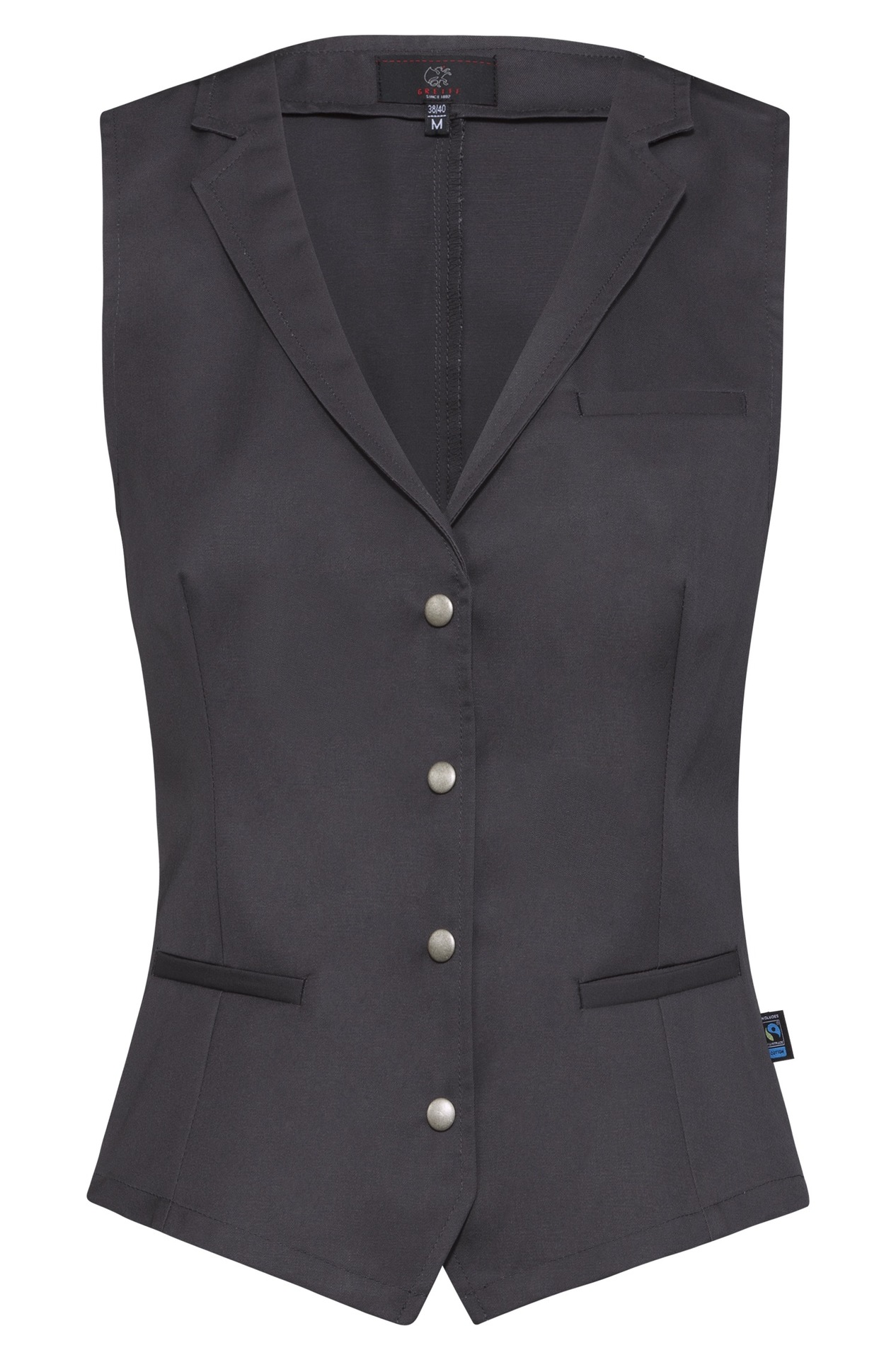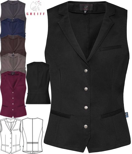 Ca. 215 g/m², 60° waschbar, 4 Druckknöpfe, ungefüttert, Stoffrücken, 2 Leistentaschen, 1 Brustleistentasche, Tunnelzug für Taillenverstellung, Rückenlänge bei Gr. 38 ca. 55 cm, Greiff Damen Weste in schwarz, anthrazit, taupe und bordeaux erhältlich, bitte wählen Sie die Farbe aus, Gr. XS-3XL