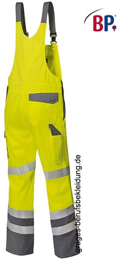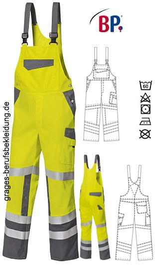 Ca. 270 g/m², 60° waschbar, Stretchträger mit Kunststoff-Steckschnallen, doppelte Latztasche mit Patte verschließbar, davon 1 mit verdecktem Reißverschluss, 2 Stifttaschen, BP Warnschutzlatzhose mit 2 Seitentaschen, Schenkeltasche mit aufgesetzter Smartphone- und Stifttasche, Schenkel- und Smartphonetasche mit Patte verschließbar, hochgezogener Rücken, freihängende doppelte Zollstocktasche, 1 mit Patte verschließbare Gesäßtasche, je 2 umlaufende Reflexstreifen auf dem unteren Bein, je 1 umlaufender Reflexstreifen auf dem oberen Bein, Bundweite regulierbar durch verstellbaren Stretchkeil BP Flex, Knieeinschubtaschen für Kniepolster 1839 000 53 (bitte separat bestellen), integrierter UV Schutz nach Standard 801, DuraClean Ausrüstung zur besseren Schmutzablösung, Schrittlänge ca. 81 cm, Öko-Tex Standard 100, Industriewäsche-geeignet nach ISO 15797, 360° Sichtbarkeit, Gr. 44n-64n, 48l-54l, 48s-56s