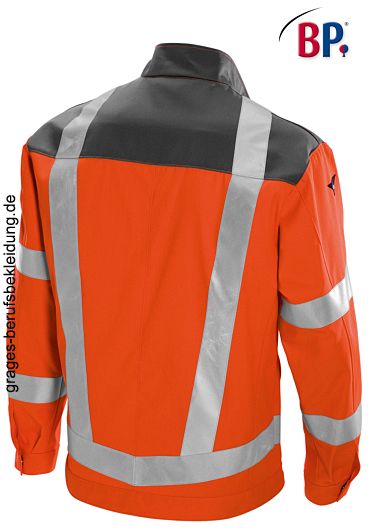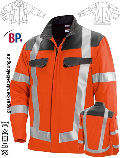 Ca. 270 g/m², 60° waschbar, Warnschutzkleidung orange, Stehkragen, verdeckter Reißverschluss, 2 mit Patte verschließbare Brusttaschen, BP Arbeitsjacke mit 2 Seitentaschen, 1 Innentasche, 1 innenliegende Smartphonetasche mit Patte, verschließbare Ärmelbündchen, je 2 Reflexstreifen auf dem Ärmel, 1 umlaufender Reflexstreifen oberhalb des Bundes, je 2 umlaufende vertikale Reflexstreifen vorne und hinten, integrierter UV Schutz nach Standard 801, DuraClean Ausrüstung zur besseren Schmutzablösung, Rückenlänge ca. 75 cm, Öko-Tex Standard 100, Industriewäsche-geeignet nach ISO 15797, 360° Sichtbarkeit, Gr. 44/46n-64/66n, 44l/46l-52/54l