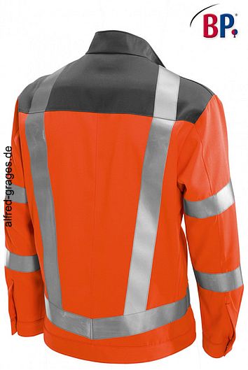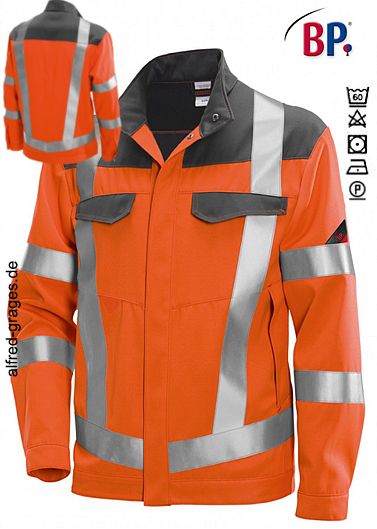 Ca. 320 g/m², 60° waschbar, BP Warnschutzkleidung orange, Stehkragen, verdeckte Druckknopfleiste, 2 mit Patte verschließbare Brusttaschen, 2 mit Blende verschließbare Seitentaschen, 1 Innentasche, 1 innenliegende Handytasche mit Patte, verschließbare Ärmelbündchen, je 2 Reflexstreifen auf dem Ärmel, 1 umlaufender Reflexstreifen oberhalb des Bundes, 2 umlaufende vertikale Reflexstreifen vorne und hinten, integrierter UV Schutz nach Standard 801, inhärenter Flammschutz, EN ISO 20471; EN ISO 11611 cl.1 - A1; EN ISO 11612 A1, B1, C1, F1; EN 1149-5; EN 61482-1-2 cl.1; EN 13034-6, Rückenlänge ca. 76 cm, Industriewäsche-geeignet nach ISO 15797, Gr. 44/46n-64/66n, 44/46l-52/54l