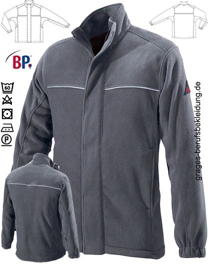 Ca. 350 g/m², 60° waschbar, BP Jacke mit Stehkragen, Frontreißverschluss durch Druckknopfleiste verdeckt, 2 Seitentaschen mit Reißverschluss, ergonomisch geformter Ärmel, elastischer Ärmelabschluss, Armliftsystem für mehr Beweglichkeit, 2 Innentaschen, innenliegende Saumweitenverstellung, verlängerte Rückenpartie, horizontale Reflexpaspel vorne und hinten, passend zu allen schwerentflammbaren Produkten, EN ISO 11612 A1, B1, C1; EN 1149-5; EN 61482-1-2 cl.1, permanent flammhemmend durch Modacryl, Öko-Tex Standard 100, Rückenlänge ca. 78 cm, Gr. XS-3XL