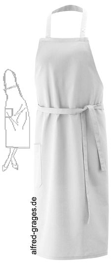 Ca. 190 g/m², 90° waschbar, weiß, Breite x Länge: ca. 80 x 100 cm, verstellbares Halsband, durchgehende, genähte Stoffbänder, Taschegröße ca. 20 x 18 cm, Öko-Tex Standard 100, Bügelleichte- und Softausstattung