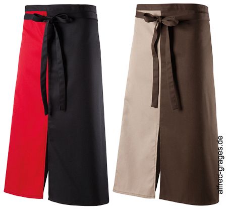 Ca. 220 g/m², 75° waschbar, Schürze mit Gehschlitz mittig, 2-farbig, durchgehende Stoffbänder, Breite x Länge ca. 100x80 cm, Öko-Tex Standard 100, Bügelleichte- und Softausstattung, Bistroschürze in schwarz/rot und braun/sand erhältlich, bitte wählen Sie die Farbe aus