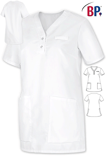 Ca. 180 g/m², 95° waschbar, Industriewäsche-geeignet nach ISO 15797, BP Kittel mit V-Ausschnitt mit schmaler Druckknopfleiste, Armliftsystem für mehr Bewegungsfreiheit, 2 geräumige Seitentaschen, davon eine mit Piepertasche, Schlaufe für Namensschild, Rückenlänge ca. 75 cm, Gr. XS-3XL