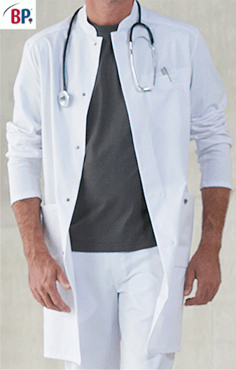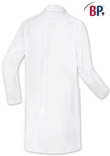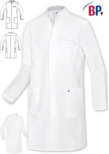Ca. 200 g/m², 95° waschbar, Industriewäsche-geeignet nach ISO 15797, Stretcheinsätze zum Hochstreifen der Ärmel, Armliftsystem für mehr Bewegungsfreiheit, Brustleistentasche, BP Mantel mit Stehkragen mit silbernem Innenkragen, 2 geräumige Seitentaschen, verdeckte Druckknopfleiste, Rückenlänge ca. 100 cm, Gr. 44n-56n