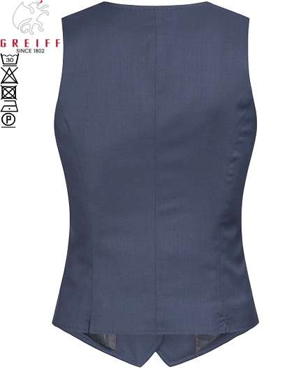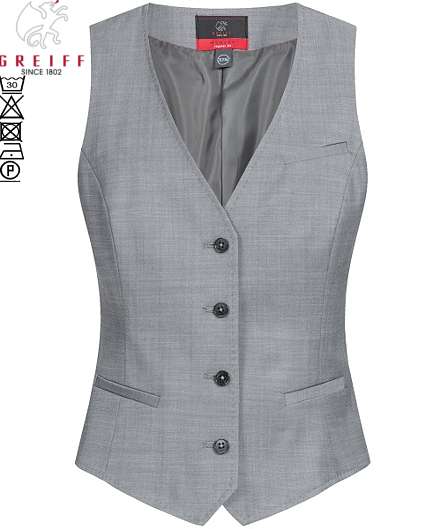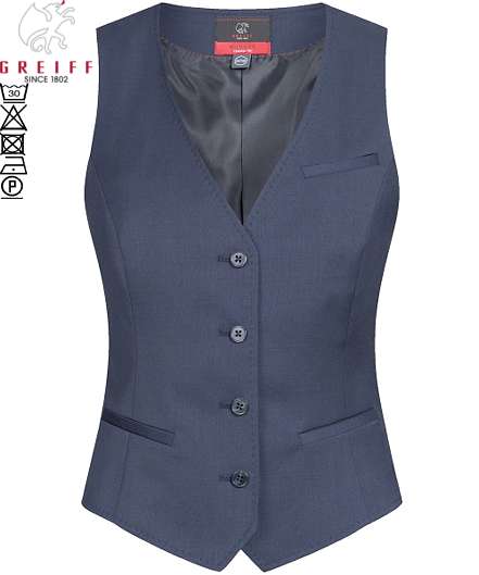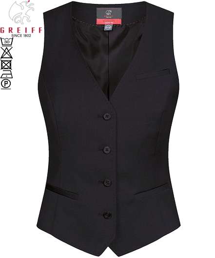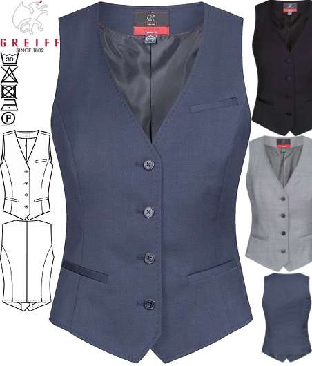 Ca. 190 g/m², 30° waschbar, Greiff Weste Damen MODERN-Line, Regular Fit, 4-Knopf, 2 Leistentaschen, 1 Brustleistentasche, AMF-Handstich, Stoffrücken, Rückenlänge bei Gr. 38 ca. 52 cm, Stretch, Greiff Damen Weste in schwarz, hellgrau und dunkelblau erhältlich, BITTE WÄHLEN SIE DIE FARBE AUS, Gr. 32-54