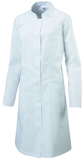 Ca. 220 g/m², 90° waschbar, Arbeitskittel Damen mit Stehkragen, 1 Brusttasche (Größe: ca. B 12cm x H 13cm), 2 Seitentaschen, verdeckte Druckknopfleiste, Gehschlitz, Rückenlänge bei Gr. M ca. 101 cm, pflegeleicht, Gr. XS-5XL