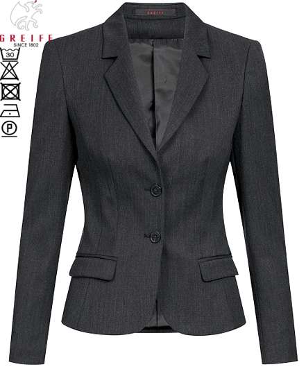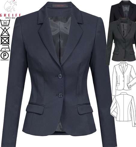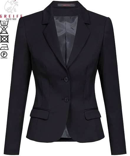 Ca. 235 g/m², 30° waschbar, Slim Fit, 2-Knopf, wasser- und schmutzabweisend, Stretch, 2 Pattentaschen, 1 Reißverschluss-Innentasche, Rückenlänge bei Gr. 38 ca. 56 cm, Greiff Blazer Damen in schwarz, anthrazit und marineblau erhältlich, BITTE WÄHLEN SIE DIE FARBE AUS, Gr. 32-42