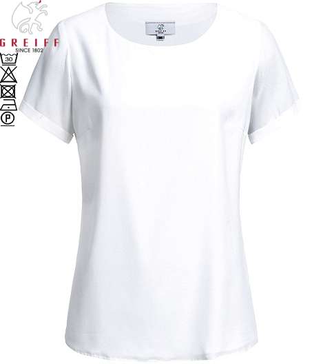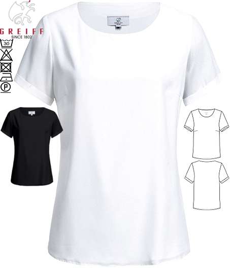 Ca. 85 g/m², 30° waschbar, Regular fit, easy care, Rundhalsausschnitt, Ärmel mit Aufschlag, Greiff Chiffon Bluse kurzarm in schwarz und weiß erhältlich, BITTE WÄHLEN SIE DIE FARBE AUS, Gr. 32-54 (ab Gr. 50 Übergröße = EUR 43,90, ab Gr. 54 Übergröße = EUR 49,90)