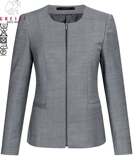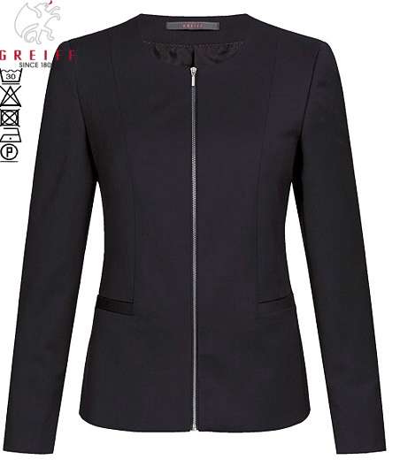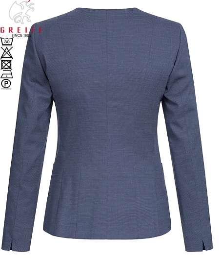 Ca. 190 g/m², 30° waschbar, Greiff Blazer MODERN with 37.5 marine, hellgrau oder schwarz, Stretch, Rundhalsausschnitt, Reißverschluss, 2 Leistentaschen, 1 Reißverschluss-Innentasche, AMF-Handstich, Rückenlänge bei Gr. 38 ca. 60 cm, Gr. 32-54