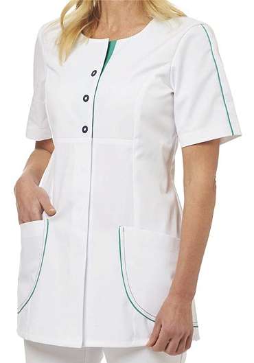 Ca. 190 g/m², 95° waschbar, Leiber Hosenkasack Damen weiß mit smaragd-farbiger Paspel an Ärmel und Seitentaschen, 2 Seitentaschen, Druckknöpfe, Seitenschlitze, Rückenlänge bei Gr. 38 ca. 74 cm, weiß, Gr. 34-52