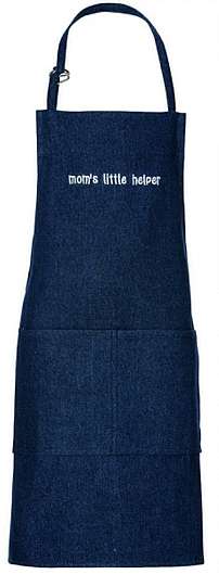 Ca. 295 g/m², 40° waschbar, Kinderlatzschürze marineblau mit verstellbarem Nackenband mit D-Ring, aufgesetzte Tasche mit 2 Fächern, Tasche BxH ca 31x17 cm. Breite x Länge = 45 x 60 cm, mit Stickerei "mom's little helper" mittig auf dem Latz in weiß (BxH ca. 13x1,5 cm)