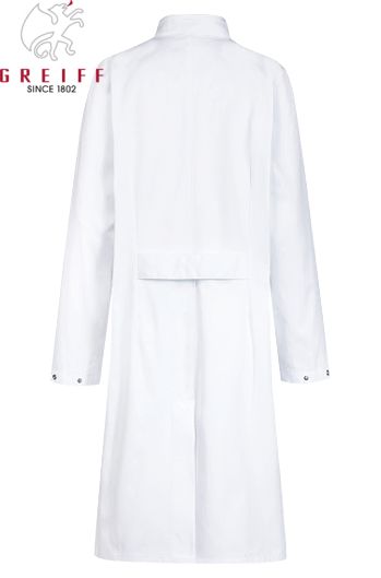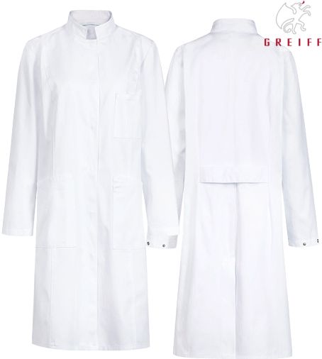 Ca. 205 g/m², 95° waschbar, Arztkittel Damen Regular Fit, Stehkragen, verdeckte Druckknopfleiste, 3 aufgesetzte Taschen, 1 Innentasche mit Druckknopf, Keyloop, Rückenschlitz, Rückengurt, Rückenlänge ca. 97 cm bei Gr. 38, Gr. 32-54