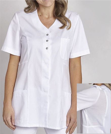 75° waschbar, Industriewäsche geeignet, sehr softes Gewebe aus Lyocellfasern, 2 Seiten- und 1 Brusttasche, verdeckte Druckknopfleiste, Rückenschlitze, atmungsaktives Stretchgewebe aus Pique-Geweb aus Lyocellfasern in Seitenpassen, Leiber Kasack Damen, Rückenlänge bei Gr. S ca. 75 cm, Gr. XS-3XL