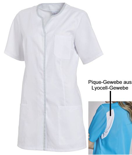 75° waschbar, Industriewäsche geeignet, sehr leichtes und weiches Gewebe, 2 Seiten- und 1 Brusttasche, verdeckte Druckknopfleiste, Seitenschlitze, atmungsaktives Stretchgewebe aus Pique-Geweb aus Lyocellfasern am hinteren Schulterbereich, Leiber Kasack Damen, Rückenlänge bei Gr. 38 ca. 75 cm, Gr. 34-52
