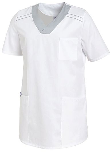 Ca. 150 g/m², 95° waschbar, Industriewäsche geeignet, sehr leichtes und weiches Gewebe, Unisex Schlupfkasack im sportlichen Style, 1/2 Arm, Leiber Schlupfkasack weiß mit silbergrau, 2 Seitentaschen, 1 Brusttasche, Seitenschlitze, Rückenlänge bei Gr. M ca. 76 cm, Gr. XS-3XL