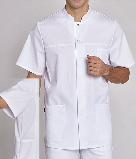Ca. 150 g/m², 75° waschbar, Clean Dress, ISO 15797 / PRO-Label 6 Industriewäsche geeignet, Materialmix aus Pique-Ware und leichter Webware, atmungsaktives Stretchgewebe aus Pique-Gewebe aus Lyocellfassern in Seitenpasse, Leiber Herren Kasack mit verdeckten Druckknöpfen, 2 Seitentaschen, 1 Brusttasche, Seitenschlitze, Rückenlänge bei Gr. S ca. 76 cm, Gr. S-4XL