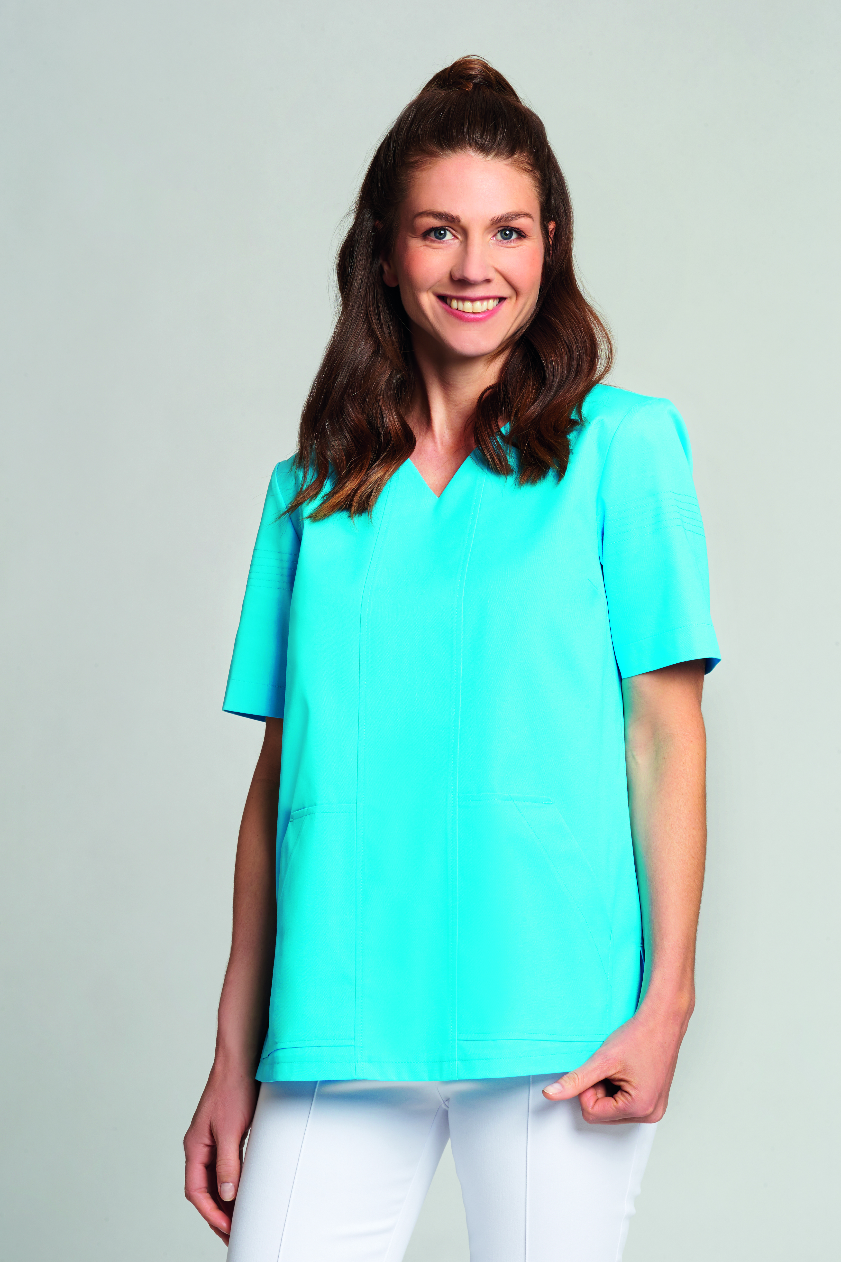Ca. 180 g/m², 60° waschbar, ISO 15797 / PRO-Label Industriewäsche geeignet, 1/2 Arm, Berufsbekleidung Damen Schlupfkasack in marineblau, beere oder türkis, Gewebe aus recyceltem Polyester, Vorderteil mit 2 Teilungsnähten, 2 Seitentaschen, Ärmel mit Ziersteppung, Seitenschlitze, Rükenlänge Gr. S = ca. 67 cm, Abbildung hier türkis, bitte wählen Sie die Farbe aus, Gr. XS-3XL