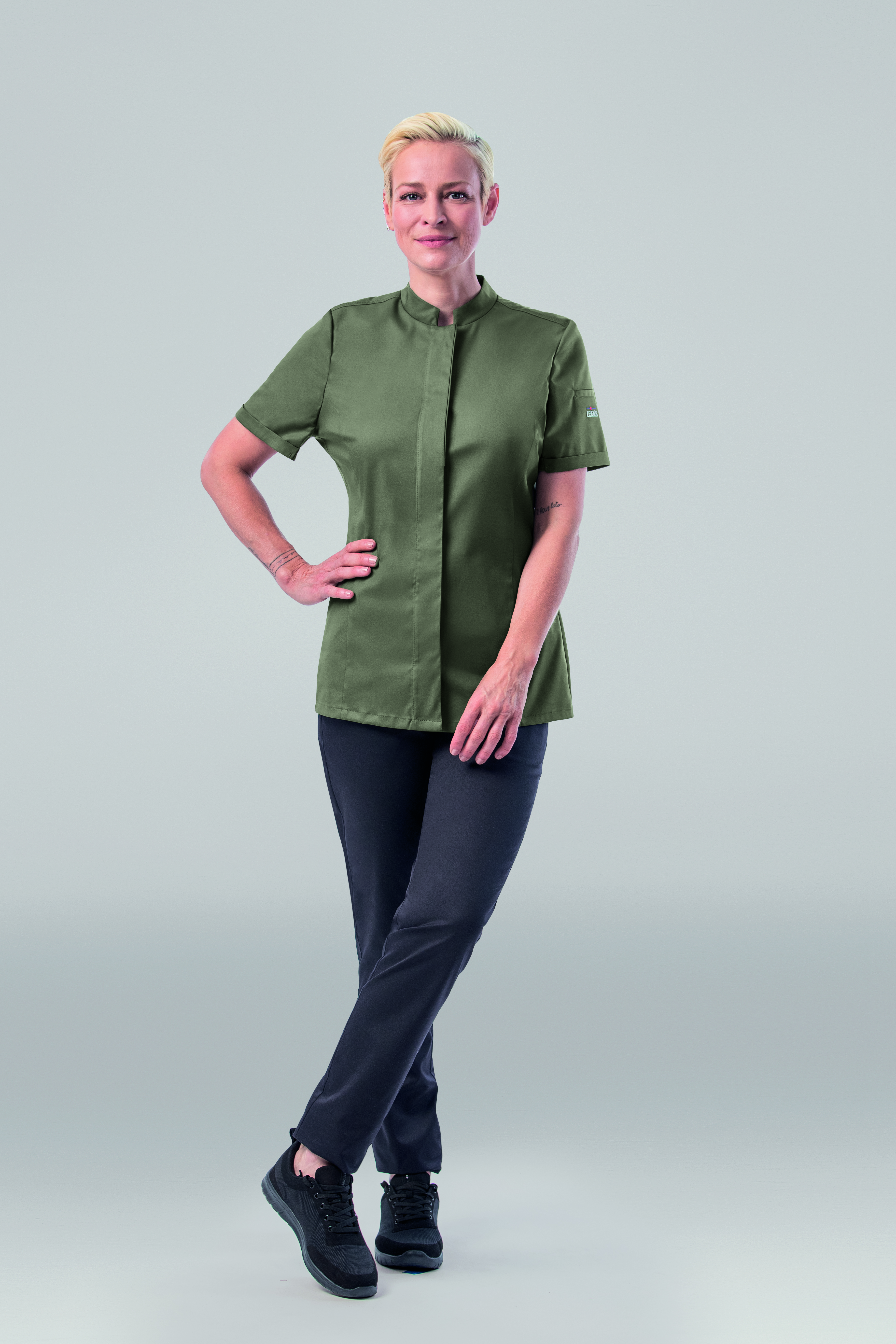 Ca. 180 g/m². 95° waschbar, ISO 15797 / PRO-Label Industriewäsche geeignet, Kochhemd Damen oliv mit verdeckter Druckknopfleiste, 1 eingelassene Ärmeltasche, LEIBER Logo auf linkem Ärmel, weiches, elastisches und formstabiles TENCEL™-Gewebe, Piqué-Einsätze aus TENCEL™-Gewebe an den Schultern, Ärmeln und den Seitenteilen, Rückenlänge Gr. S = ca. 68 cm, Gr. XS-2XL